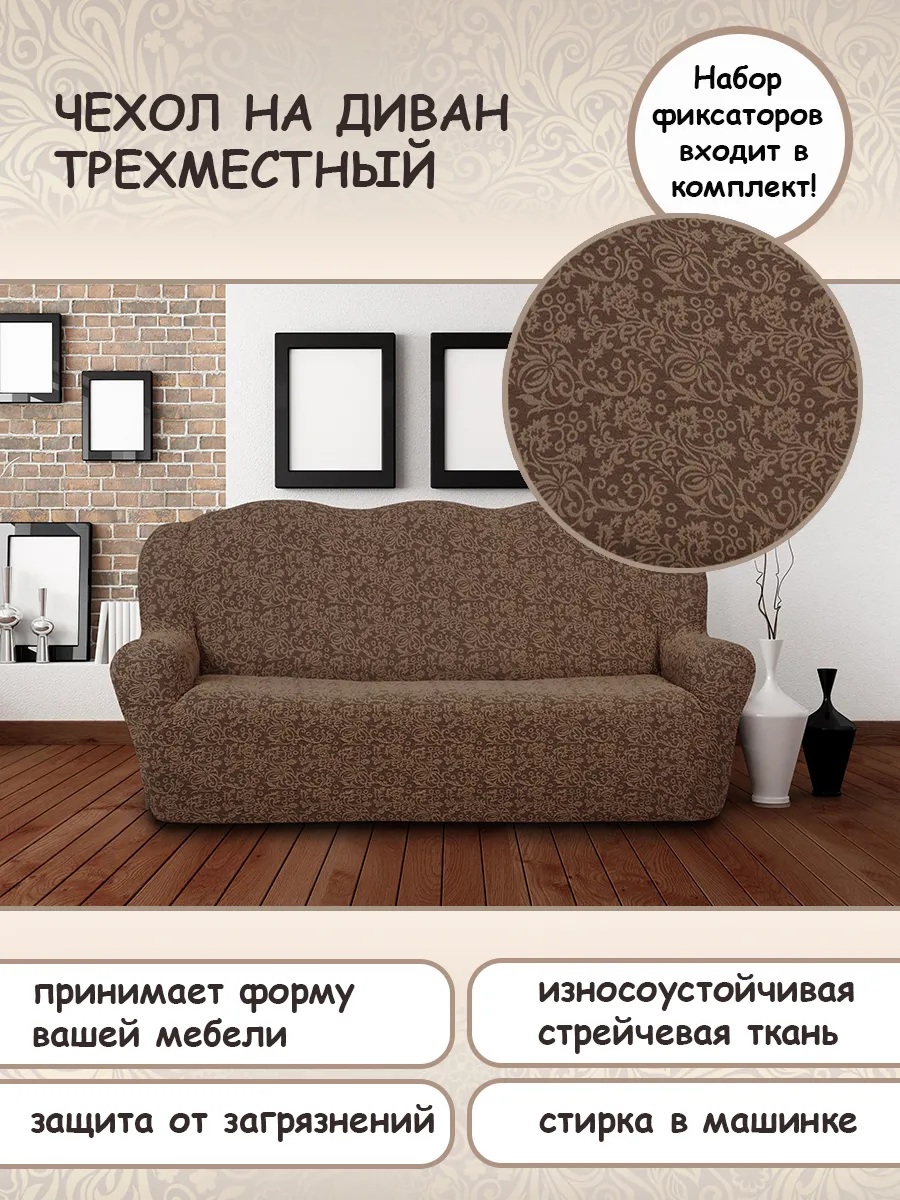 Чехол на 3-х местный диван без оборки Буклированный Жаккард,темно-коричневый