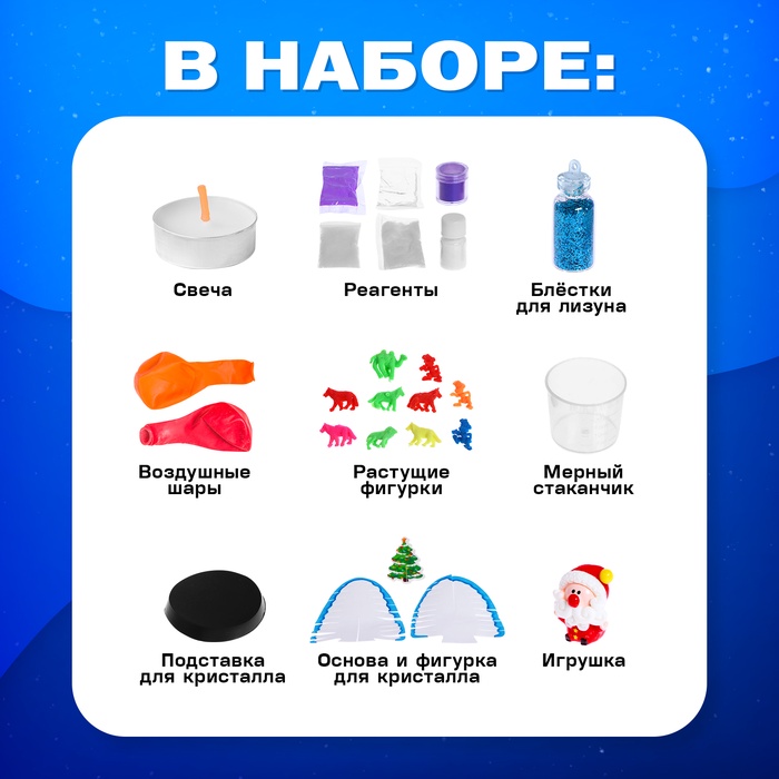 - 9 научных сюрпризов: в каждом окошке — отдельный эксперимент. Создайте химическую грелку, вырастите кристаллическую ёлку, напишите письмо Деду Морозу особыми чернилами. Никаких повторений — только новые открытия.