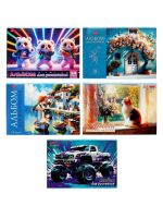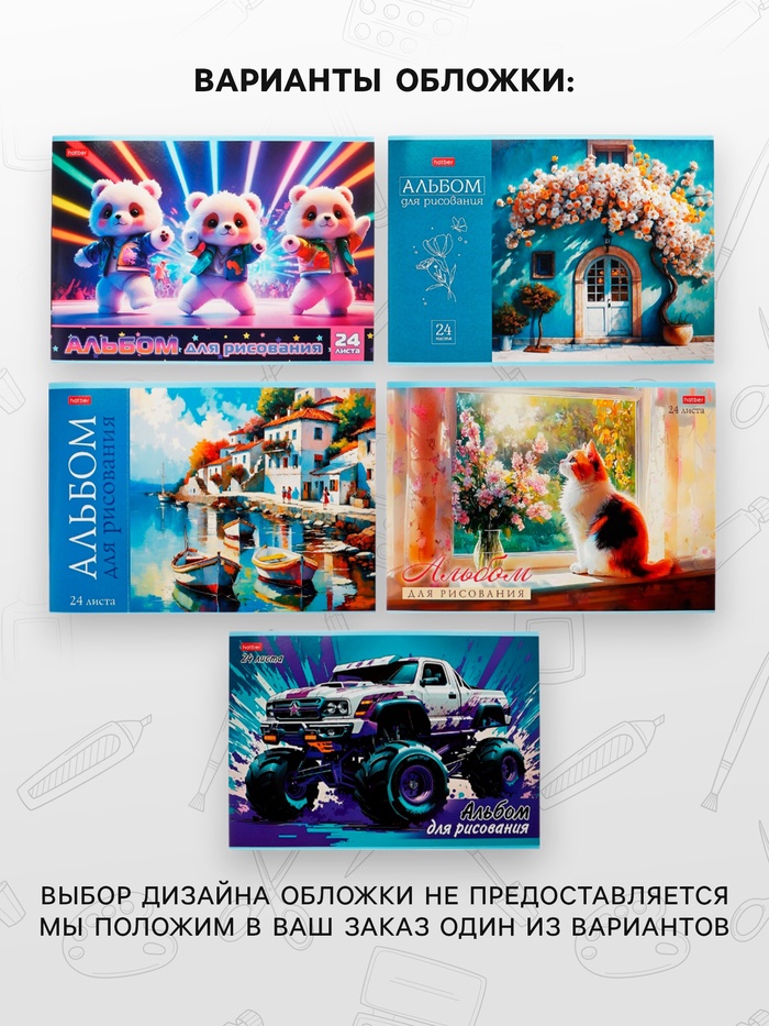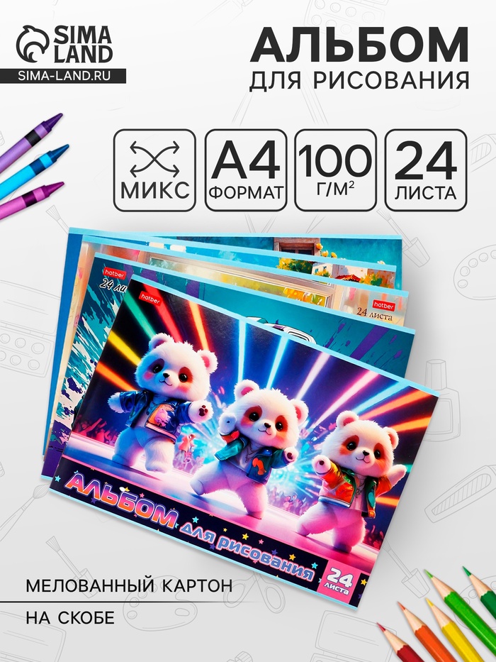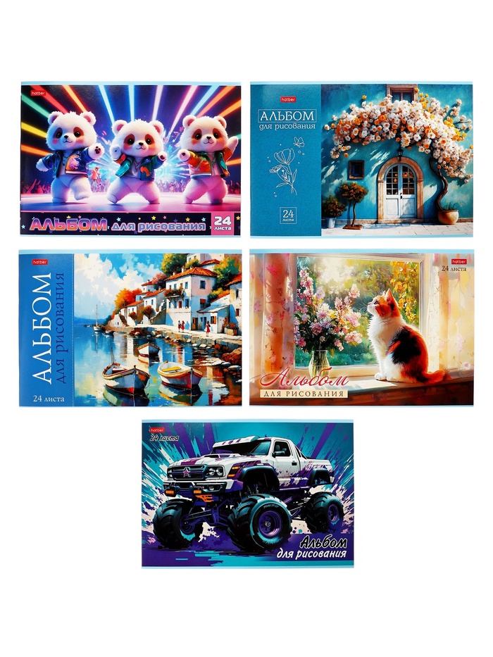Альбом для рисования А4, 24 листа на скобе Hatber "Ассорти. Выпуск №4", обложка мелованный картон, блок офсет, МИКС 5 видов