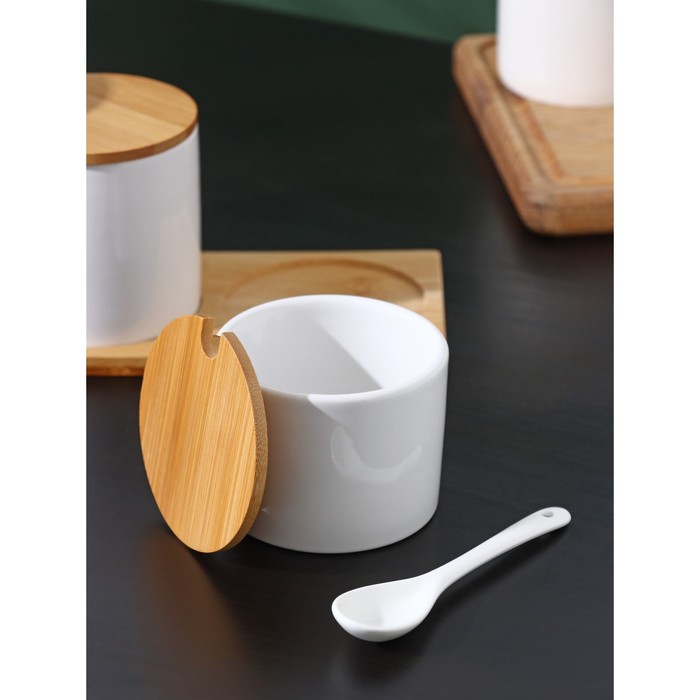 Банки для хранения сыпучих продуктов на бамбуковой подставке BellaTenero, 6 предметов: 3 банки 150 мл, 250 мл, 350 мл, 3 ложки, цвет белый
