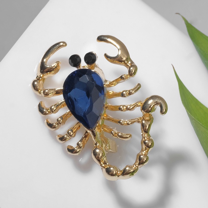 Глубокие сине-черные оттенки в сочетании с золотистой основой создают эффектный образ, который притягивает взгляды и подчёркивает индивидуальность. Брошь в форме капли с изображением знака зодиака Скорпион — это не просто украшение, а символ силы, страсти и загадочности, который идеально дополнит любой наряд.