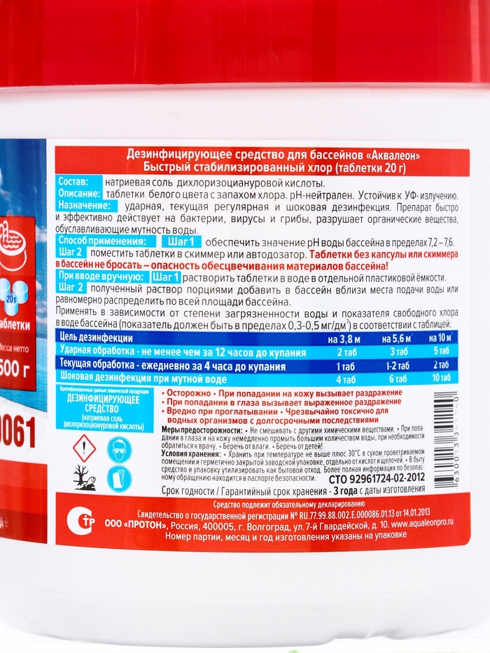 Способ применения: обеспечьте значение рН воды бассейна в пределах 7,2–7,6. Предварительно растворите таблетку в воде в отдельной ёмкости. Полученную смесь порциями добавьте в бассейн вблизи места подачи воды или в нескольких местах одновременно во время работы циркуляционного насоса.