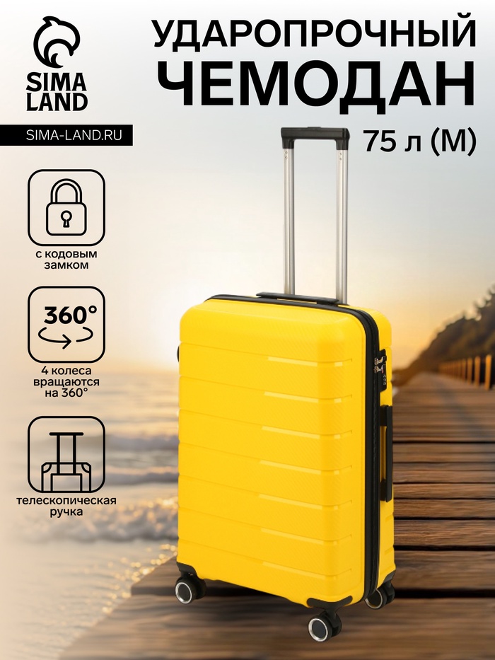 Чемодан на колёсах маленький 75 л (М), на молнии, кодовый замок, 4 колеса, жёлтый