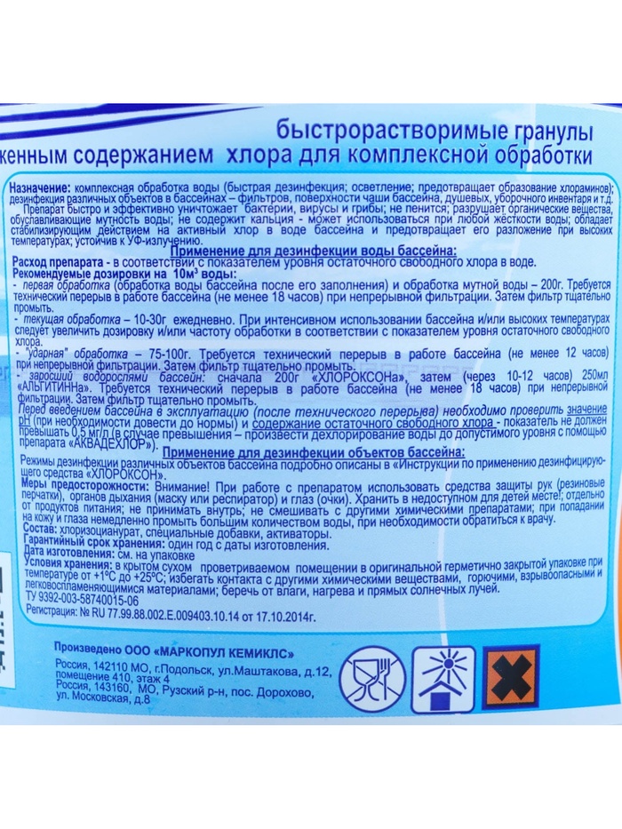 Назначение: комплексная обработка воды хлором (быстрая дезинфекция, осветление воды за счет разрушения органических соединений, борьба с хлораминами) и дезинфекция различных объектов в бассейне - фильтров, чаши бассейна, душевых, уборочного инвентаря и т.п.