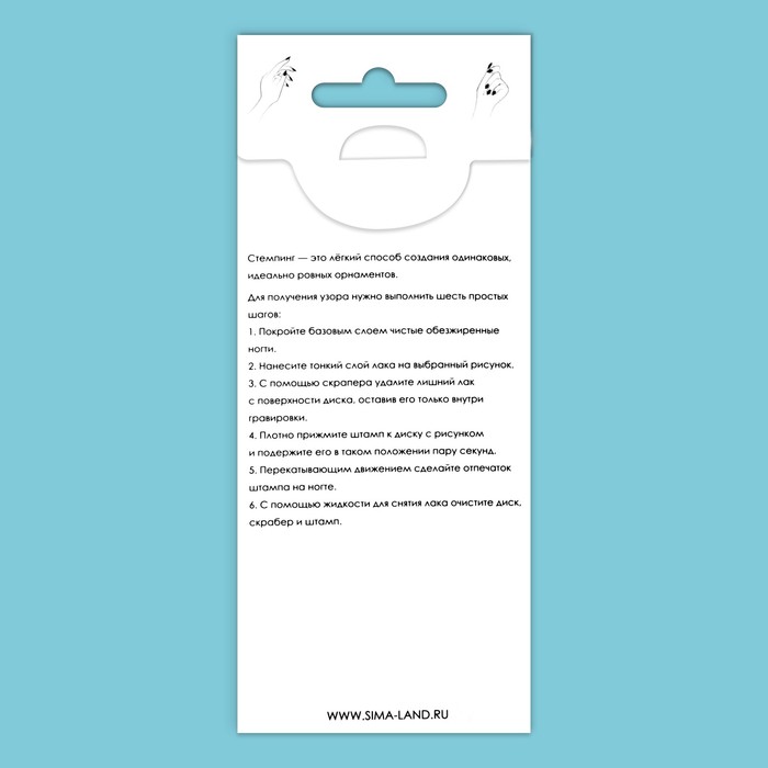 Для эффективного использования дисков рекомендуется применять специальный гель лак, штамп и лопаточку. Это гарантирует получение качественного результата без лишних усилий. Отличный выбор для повседневного или праздничного маникюра, акцентирующего внимание на деталях.