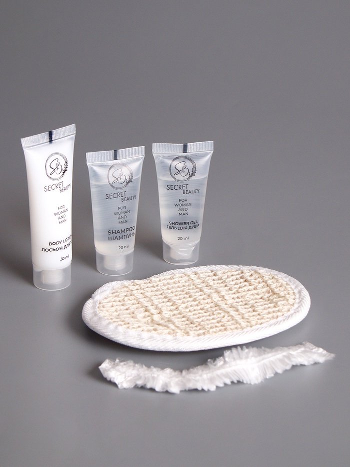 Набор для отелей: шампунь, гель для душа, шапочка, лосьон и мочалка — полноценный комплект, который обеспечивает гостям максимальный комфорт и заботу во время пребывания. Все средства разработаны с учетом потребностей разных типов кожи и волос, обеспечивая деликатный уход и глубокое очищение.