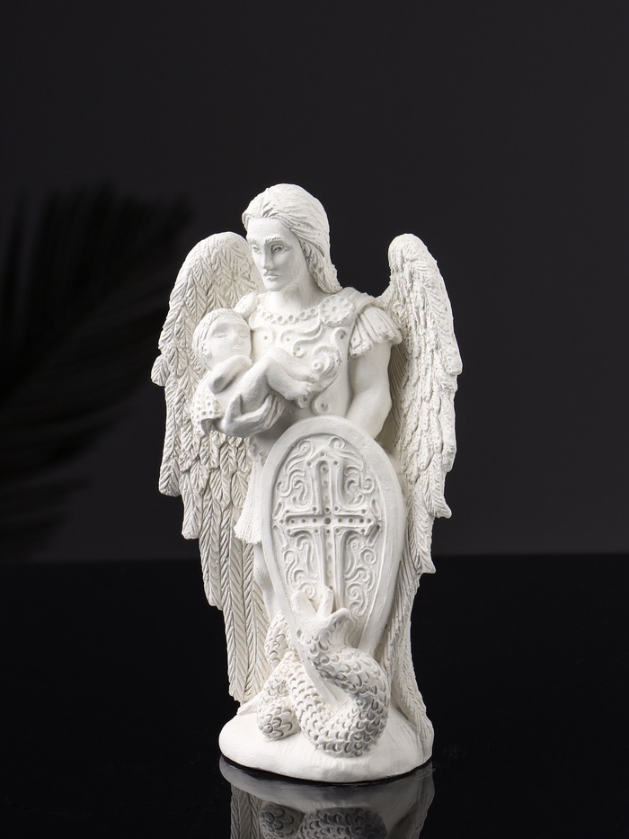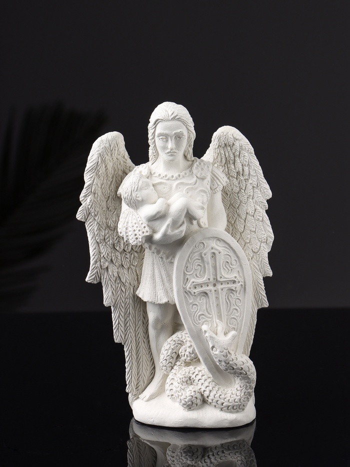Эта изысканная гипсовая фигурка передает благородный образ небесного покровителя с удивительной детализацией. Выполненная из натурального белого гипса, она станет духовным акцентом в вашем доме или значимым подарком для верующих.