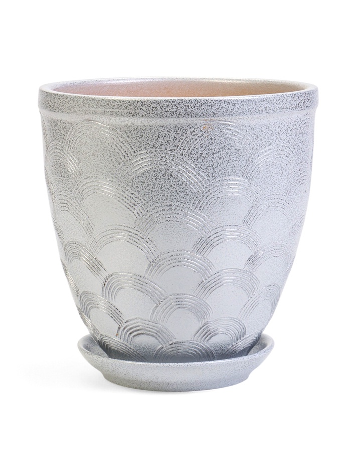 Керамический горшок «Узор» с поддоном — это стильное решение для небольших пространств. Геометрический рельеф и металлический блеск создают лаконичный современный акцент в интерьере.