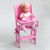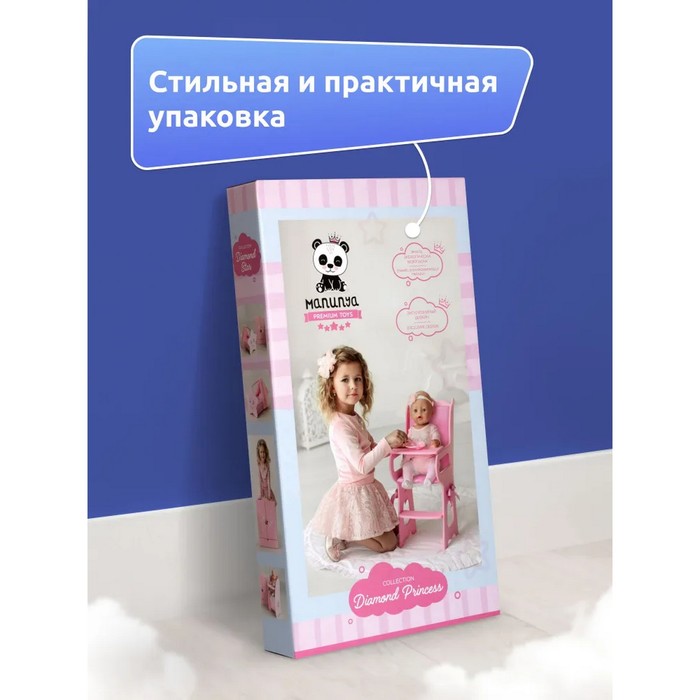 Игрушечный стульчик для кормления коллекции Diamond Princess понравится каждой девочке. В нём она с удовольствием будет кормить своего игрушечного пупсика. Стульчик украшен нарядными атласными бантиками, также у него есть мягкое хлопковое сиденье со спинкой.