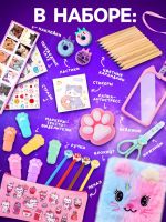 • Набор включает больше 30 предметов для творчества и учёбы: пенал, набор маркеров-текстовыделителей, цветные карандаши, стикеры, наклейки, ластики и даже пушистый блокнот.