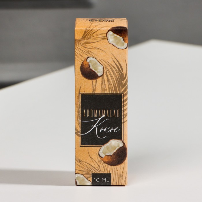 Бутылочка объемом 10 мл заключена в красивую картонную коробочку с изображением кокоса.