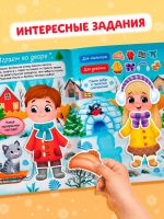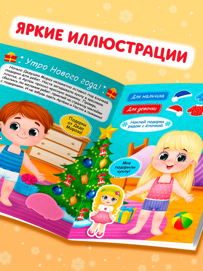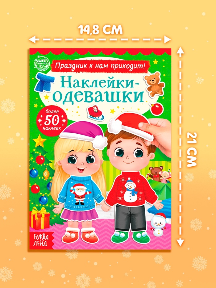 - Внутри малыша ждёт более 50 наклеек в виде одежды, аксессуаров и новогодних украшений.