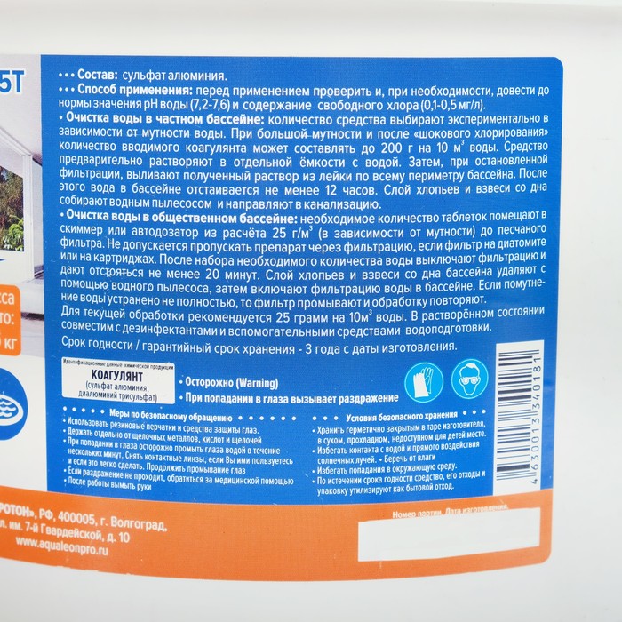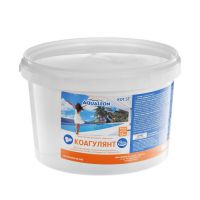 Очистка воды в общественном бассейне: необходимое количество таблеток коагулянта помещают в скиммер или автодозатор из расчёта 10–20 г на 1 м? (в зависимости от мутности) до песчаного фильтра. Не допускается пропуск препарата через фильтрацию, если фильтр на диатомите или на картриджах. После набора необходимого количества воды выключают фильтрацию и дают отстояться не менее 20 минут. Слой хлопьев и взвеси со дна бассейна удаляют с помощью водного пылесоса, затем включают фильтрацию воды. Если помутнение устранено не полностью, то фильтр промывают и обработку повторяют.