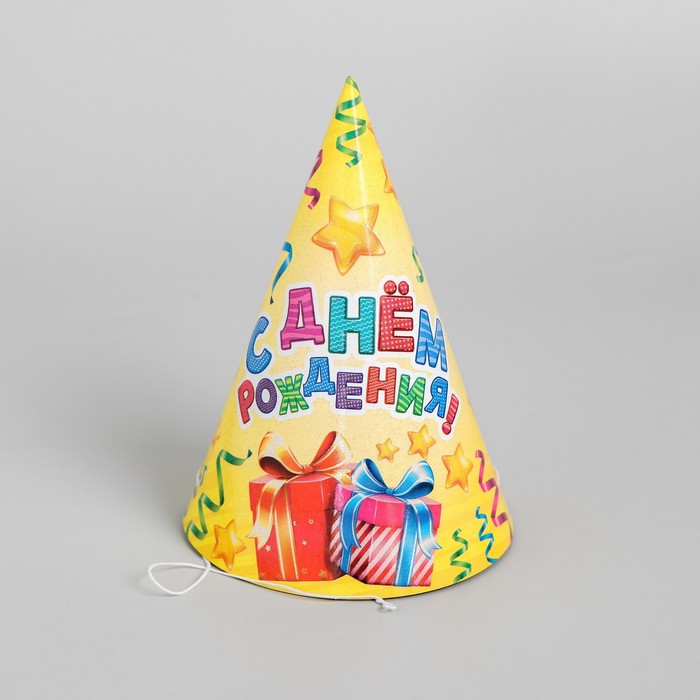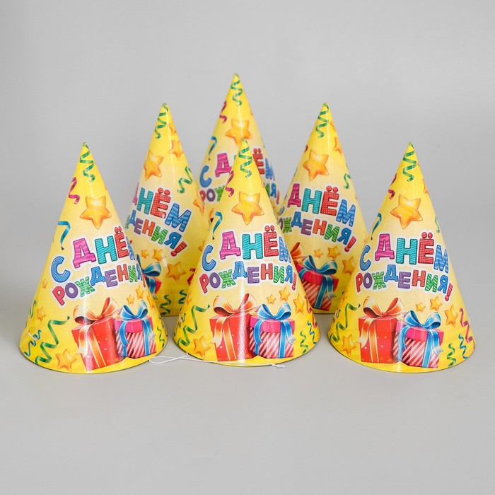 Колпак бумажный «С днём рождения», серпантин и подарки, набор 6 шт.