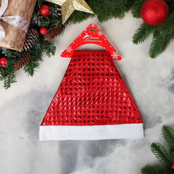 Красный текстильный новогодний колпак с выразительной фактурой создаёт праздничное настроение и подчёркивает традиции зимних торжеств. Изображение Деда Мороза добавляет тематический акцент и завершает праздничный образ.