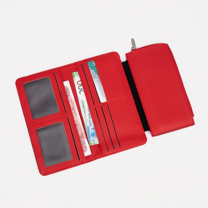 Цвет|Красный;Для кого|Для женщины;Количество отделений|3;Вид застёжки|Кнопка;Рисунок|Нет;Возраст|Взрослый;Материал|Искусственная кожа;Размер|Большой;Вид|Тройное сложение;Отдел для монет|На молнии внутри;Размер|Длина от 15 см;