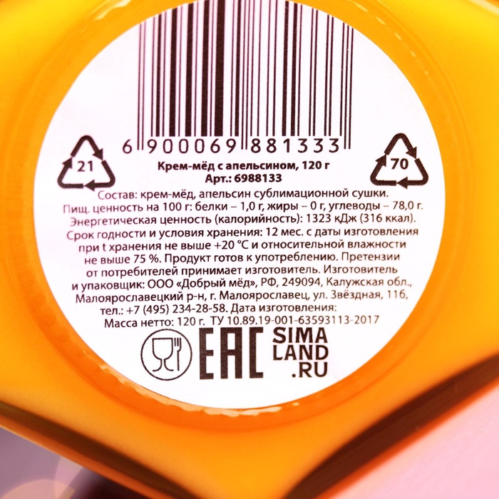 Состав: крем-мёд, апельсин сублимационной сушки.