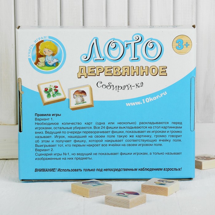 Лото деревянное «Собирай-ка» — это тематическое лото познакомит малышей с тем, какие цветы растут на клумбах, какой урожай можно собрать в саду, на огороде и в лесу. Деревянное развивающее лото, как и многие другие аналогичные игры, помогает развить у ребенка зрительную память и внимание, лучше запомнить названия.