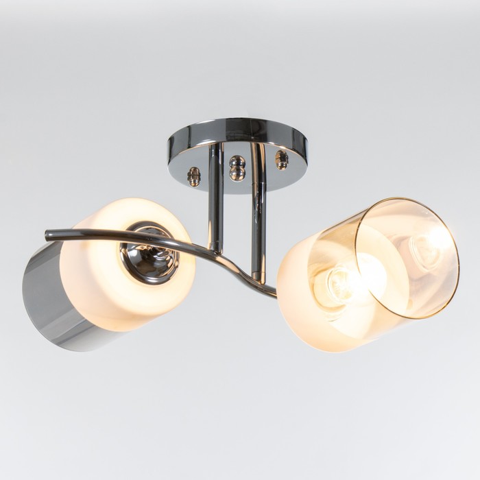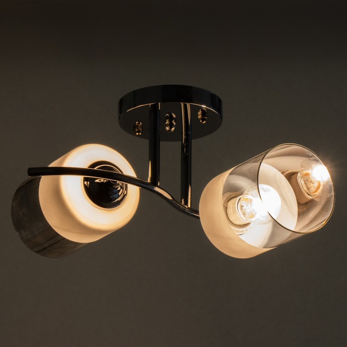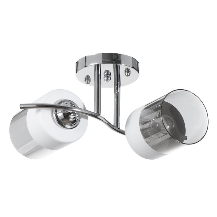 Вид лампы|Накаливания;Количество ламп|2;Стиль|Эконом;Цоколь|E27;Длина, см|30;Ширина, см|28;Высота, см|18;Площадь освещения, м²|4;Минимальная высота от потолка, см|18;Максимальная высота от потолка, см|18;Мощность на цоколь, Вт|40;Степень защиты|IP20;Назначение по помещениям|Прихожая;Назначение по помещениям|Кафе, рестораны;Назначение по помещениям|Кухня;Назначение по помещениям|Спальня;Материал основания|Металл;Цвет основания|Хром;Тип рассеивателя|Плафон;Тип подвеса|Штанга;Оттенок рассеивателя|Светлые тона;Материал рассеивателя|Стекло;Управление светильником|Без пульта;Подходит для натяжных потолков|Да (при использования светодиодных ламп);Плоская|Нет;Тип крепления|На планку;Форма рассеивателя|Цилиндр;Направление рассеивателя|В стороны;Цвет рассеивателя|Белый;Цвет рассеивателя|Тонированный;Стиль|Минимализм;Тип источника освещения|Лампа не в комплекте;
