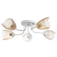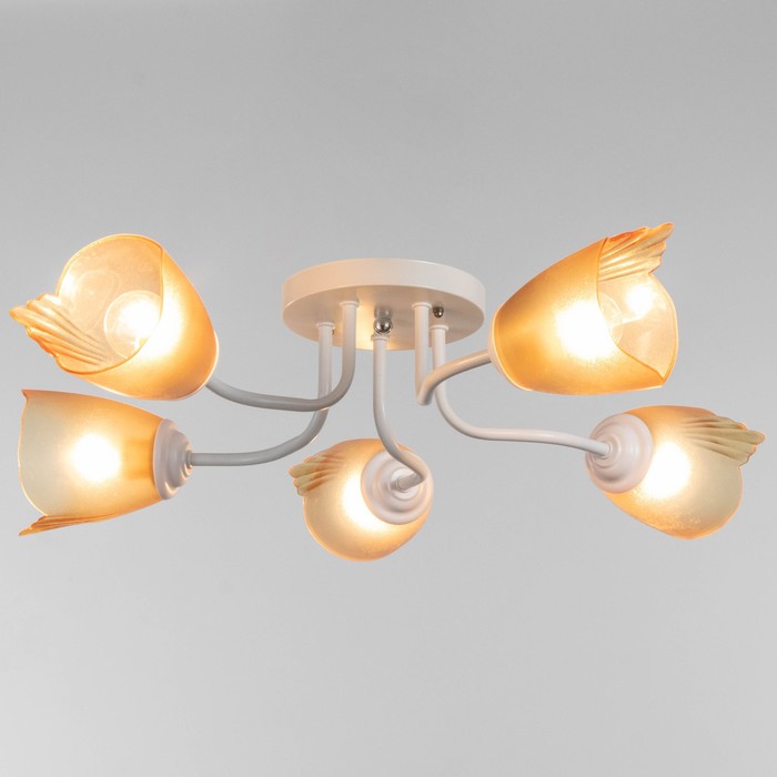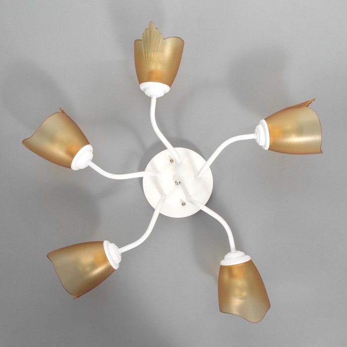 Вид лампы|Энергосберегающая;Количество ламп|5;Стиль|Эконом;Цоколь|E27;Длина, см|27;Ширина, см|19;Высота, см|13;Минимальная высота от потолка, см|13;Максимальная высота от потолка, см|13;Мощность на цоколь, Вт|15;Площадь освещения, м²|18;Степень защиты|IP20;Назначение по помещениям|Спальня;Назначение по помещениям|Гостиная;Назначение по помещениям|Кухня;Назначение по помещениям|Кафе, рестораны;Назначение по помещениям|Прихожая;Назначение по помещениям|Детская;Материал основания|Металл;Цвет основания|Белый;Тип рассеивателя|Плафон;Тип подвеса|Без подвеса (потолочный);Оттенок рассеивателя|Тёмные тона;Материал рассеивателя|Пластик;Управление светильником|Без пульта;Подходит для натяжных потолков|Да (при использования светодиодных ламп);Плоская|Нет;Тип крепления|На планку;Форма рассеивателя|Конусный;Направление рассеивателя|В стороны;Цвет рассеивателя|Коньячный;Стиль|Минимализм;Стиль|Детский;Тип источника освещения|Лампа не в комплекте;
