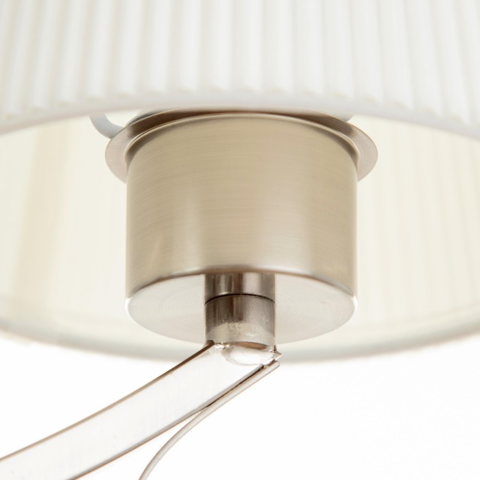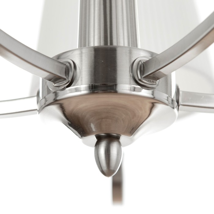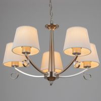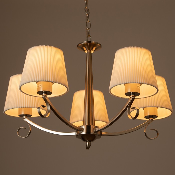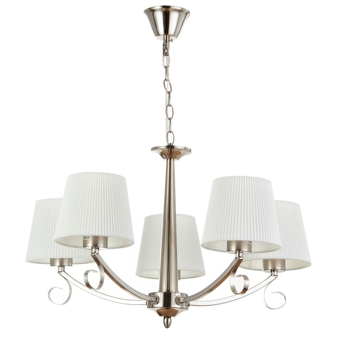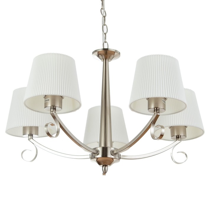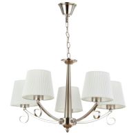 Свет, собранный как интерьерная деталь эпохи. Подвесная люстра с пятью текстильными абажурами и никелевым каркасом — аутентичное решение для гостиной, прихожей, кухни или интерьера кафе и ресторана до 10 м?. Её классический силуэт, цепной подвес и трапециевидные белые рассеиватели из ткани создают тёплую, уютную атмосферу, характерную для традиционного стиля.