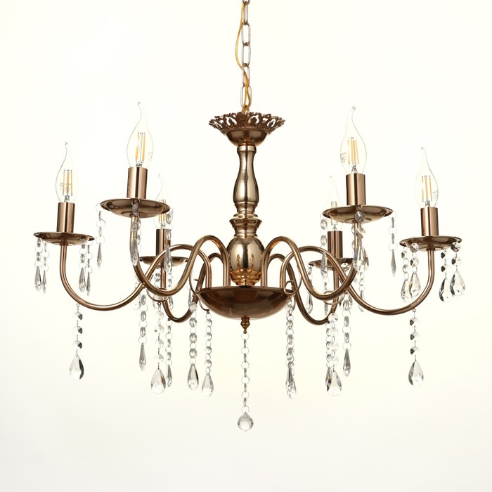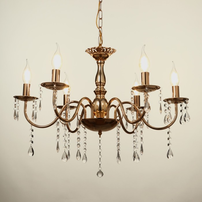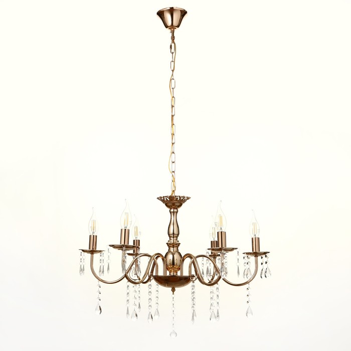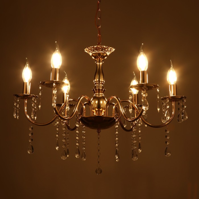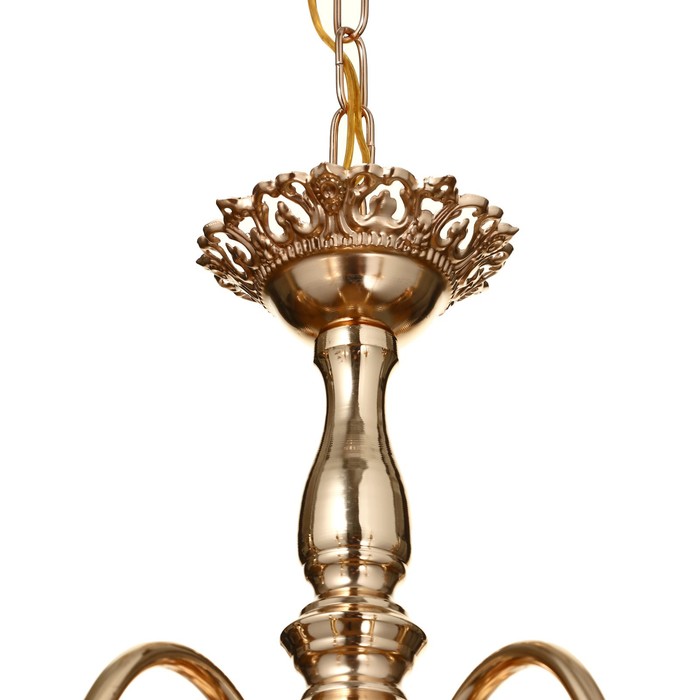 Вид лампы|Накаливания;Количество ламп|6;Цоколь|E14;Длина, см|62;Ширина, см|62;Высота, см|32;Площадь освещения, м²|12;Минимальная высота от потолка, см|22;Максимальная высота от потолка, см|32;Мощность на цоколь, Вт|40;Степень защиты|IP20;Назначение по помещениям|Прихожая;Назначение по помещениям|Спальня;Назначение по помещениям|Кухня;Назначение по помещениям|Гостиная;Материал основания|Металл;Цвет основания|Золотой;Тип рассеивателя|Под свечку;Тип подвеса|Цепь;Оттенок рассеивателя|Светлые тона;Управление светильником|Без пульта;Подходит для натяжных потолков|Да (при использования светодиодных ламп);Плоская|Нет;Тип крепления|Под крюк;Направление рассеивателя|Вверх;Стиль|Классика;Тип источника освещения|Лампа не в комплекте;
