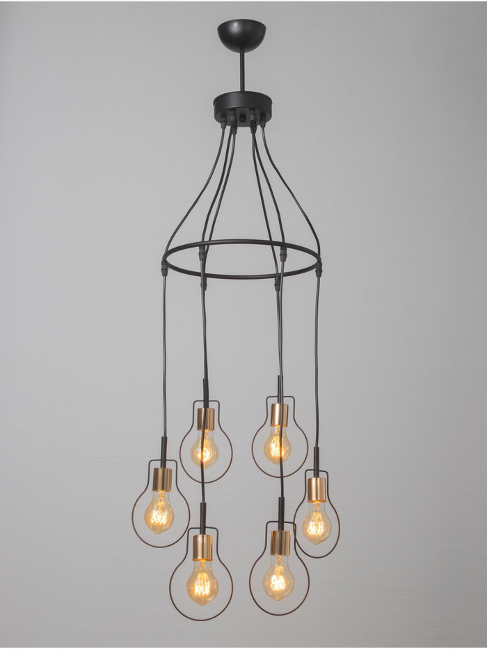 Свет, ниспадающий каскадом. Потолочный светильник 54 см с шестью лампами E27 и черно-золотым каркасом — выразительное решение для гостиной, большого зала, коридора или общественных интерьеров кафе и ресторанов до 12 м?. Его каскадная форма, открытые патроны и комбинация чёрного металла с золотистыми элементами создают атмосферу современного лофта с оттенком дизайнерской роскоши.