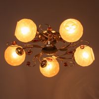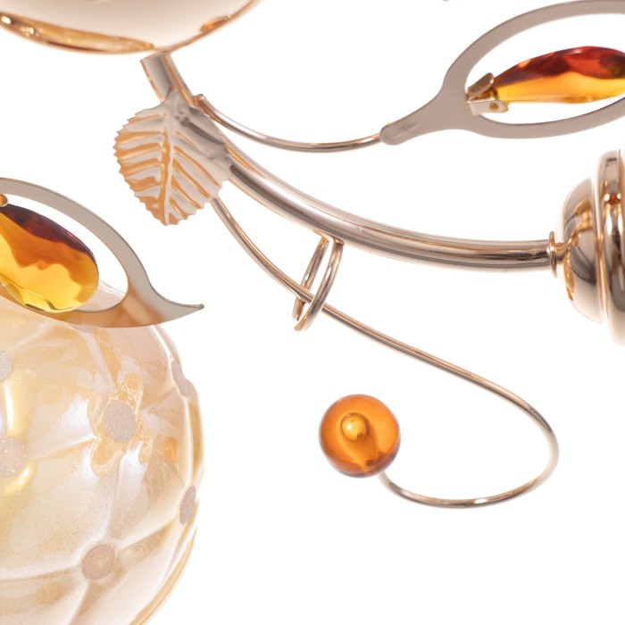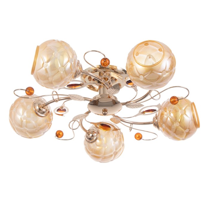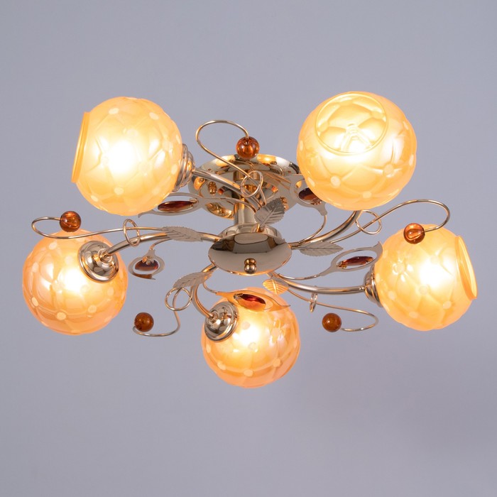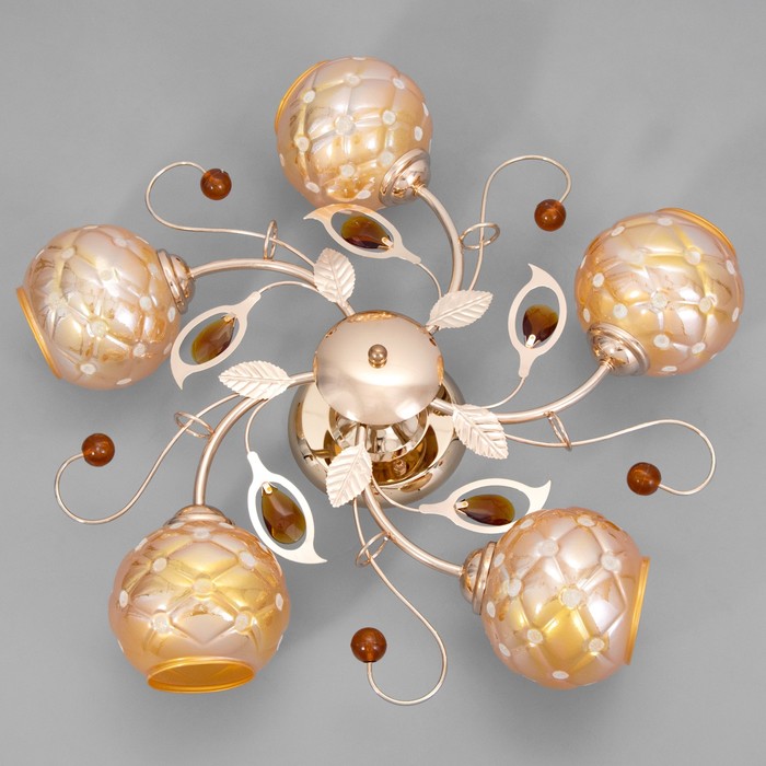 Вид лампы|Накаливания;Количество ламп|5;Стиль|Модерн и хайтек;Цоколь|E27;Длина, см|50;Ширина, см|50;Высота, см|20;Минимальная высота от потолка, см|20;Максимальная высота от потолка, см|20;Мощность на цоколь, Вт|40;Степень защиты|IP20;Назначение по помещениям|Большой зал;Назначение по помещениям|Гостиная;Материал основания|Металл;Цвет основания|Золотой;Тип рассеивателя|Плафон;Особенности светильника|Листья;Тип подвеса|Без подвеса (потолочный);Оттенок рассеивателя|Цветные;Материал рассеивателя|Стекло;Управление светильником|Без выключателя;Подходит для натяжных потолков|Да (при использования светодиодных ламп);Плоская|Нет;Тип крепления|На планку;Форма рассеивателя|Полушар;Направление рассеивателя|В стороны;Цвет рассеивателя|Золотой;Стиль|Классика;Тип источника освещения|Лампа не в комплекте;