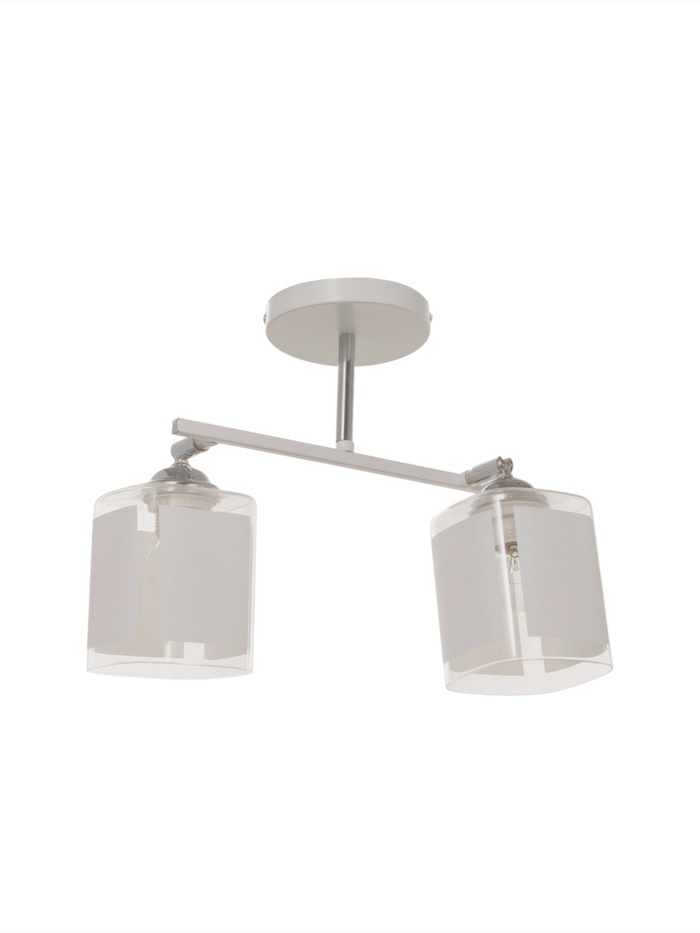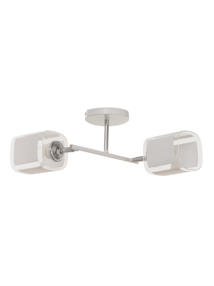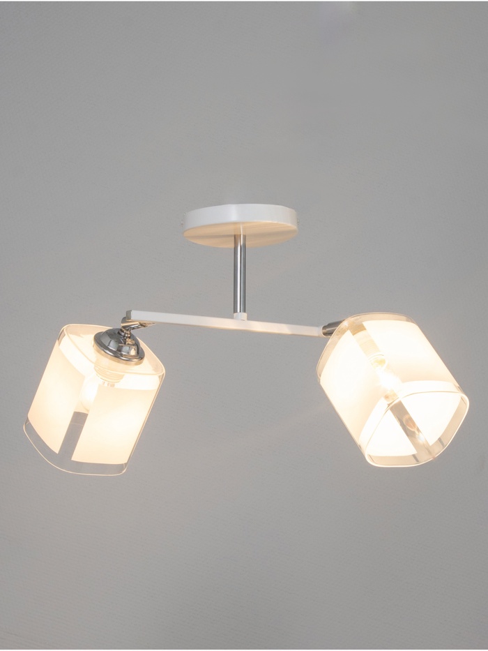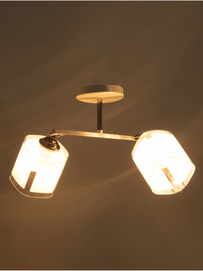 Свет в правильных пропорциях: белое стекло, чёткие линии, минимум деталей. Потолочная люстра с двумя квадратными плафонами – лаконичное решение для кухни или коридора. Её стиль — минимализм, где каждый элемент на своём месте, а свет работает на порядок, а не на декор.