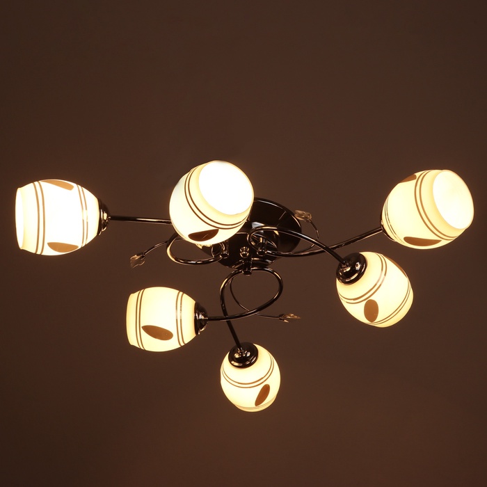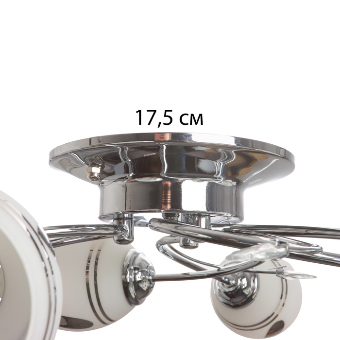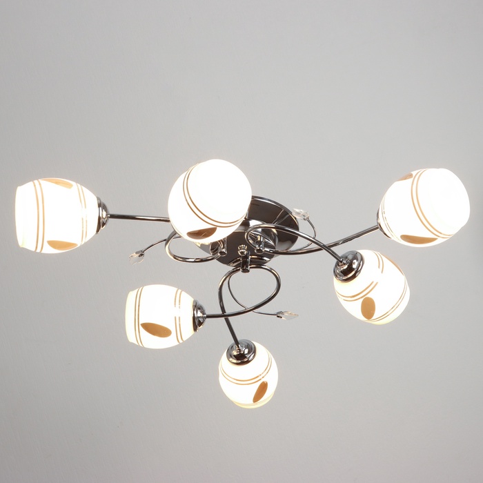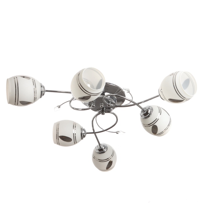 Вид лампы|Накаливания;Количество ламп|6;Стиль|Эконом;Цоколь|E27;Площадь освещения, м²|12;Мощность на цоколь, Вт|40;Степень защиты|IP20;Назначение по помещениям|Прихожая;Назначение по помещениям|Спальня;Назначение по помещениям|Кухня;Назначение по помещениям|Детская;Назначение по помещениям|Коридор;Материал основания|Металл;Цвет основания|Хром;Тип рассеивателя|Плафон;Особенности светильника|Ветки;Тип подвеса|Штанга;Оттенок рассеивателя|Светлые тона;Материал рассеивателя|Стекло;Управление светильником|Без пульта;Подходит для натяжных потолков|Да (при использования светодиодных ламп);Плоская|Нет;Тип крепления|На планку;Направление рассеивателя|В стороны;Цвет рассеивателя|Матовый белый;Цвет рассеивателя|Хром;Стиль|Классика;Тип источника освещения|Лампа не в комплекте;