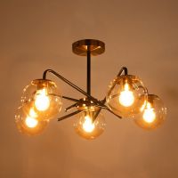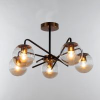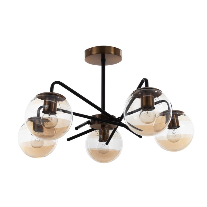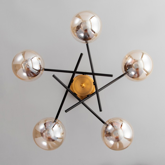 Вид лампы|Накаливания;Количество ламп|5;Стиль|Модерн и хайтек;Цоколь|E27;Длина, см|58;Ширина, см|58;Высота, см|32;Площадь освещения, м²|15;Минимальная высота от потолка, см|32;Максимальная высота от потолка, см|32;Мощность на цоколь, Вт|60;Степень защиты|IP20;Назначение по помещениям|Спальня;Назначение по помещениям|Прихожая;Назначение по помещениям|Гостиная;Назначение по помещениям|Кухня;Материал основания|Металл;Цвет основания|Золотой;Цвет основания|Чёрный;Тип рассеивателя|Плафон;Тип подвеса|Штанга;Оттенок рассеивателя|Светлые тона;Оттенок рассеивателя|Цветные;Форма|Круглая;Материал рассеивателя|Стекло;Управление светильником|Без пульта;Подходит для натяжных потолков|Да (при использования светодиодных ламп);Плоская|Нет;Тип крепления|На планку;Форма рассеивателя|Шар;Направление рассеивателя|Вниз;Цвет рассеивателя|Янтарный;Стиль|Современный;Стиль|Модерн;Тип источника освещения|Лампа не в комплекте;