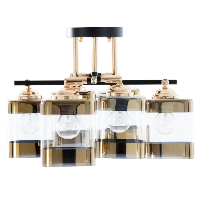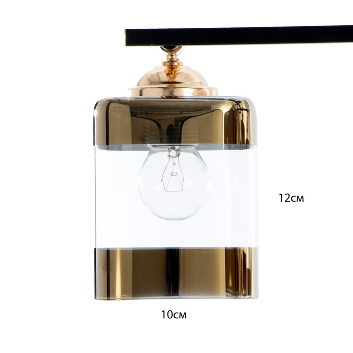 - Дизайн в стиле модерн и хайтек: Чёрный металлический каркас с золотистыми элементами и прозрачные квадратные стеклянные плафоны формируют реечную композицию — строгую, технологичную, с лёгким акцентом на детали.