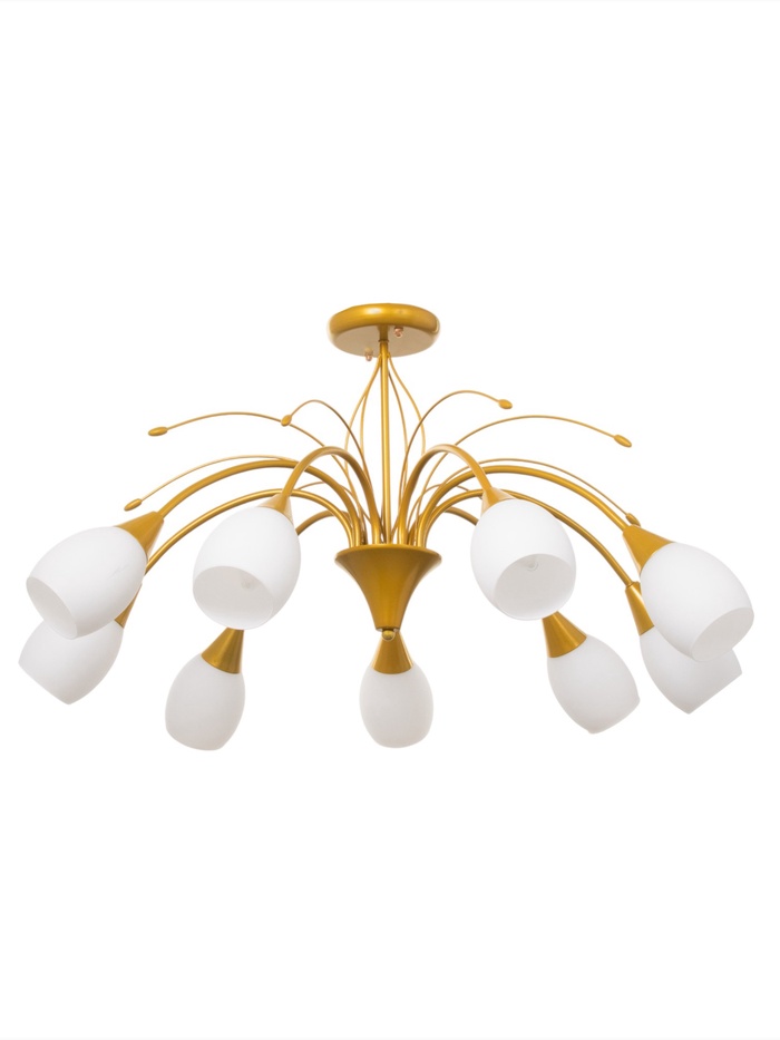 Свет, который охватывает пространство с изяществом. Девятирожковая потолочная люстра с золотым металлическим основанием и овальными белыми плафонами из стекла – это масштабное решение для гостиной, кухни или спальни, где важны насыщенное освещение, благородные оттенки и гармоничный дизайн.
