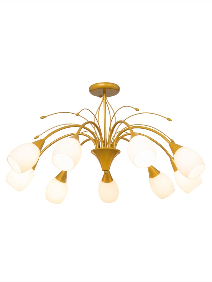 Пропорции, свет и уют: Девять овальных плафонов расположены симметрично, создавая ощущение порядка и баланса. Золотистый каркас и белое стекло работают в паре: один добавляет теплоты, другой — свежести. Это не просто источник света – это архитектурный элемент, который визуально зонирует пространство. Подходит для тех, кто ценит модерн, классику и прованс, но хочет сохранить светлую, воздушную атмосферу.