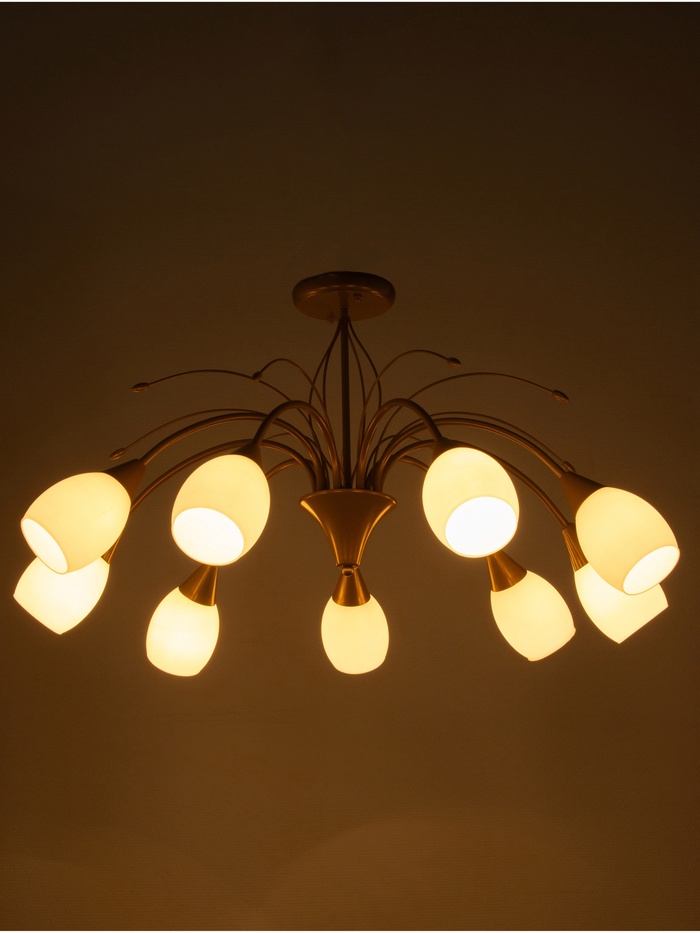 - Мощное и мягкое свечение: Девять ламп формата E14 (до 40 Вт каждая) обеспечивают интенсивный световой поток, достаточный для помещений площадью до 18 м?. Белые стеклянные овальные плафоны в светлых тонах мягко рассеивают свет вниз, создавая равномерное, без теней освещение.