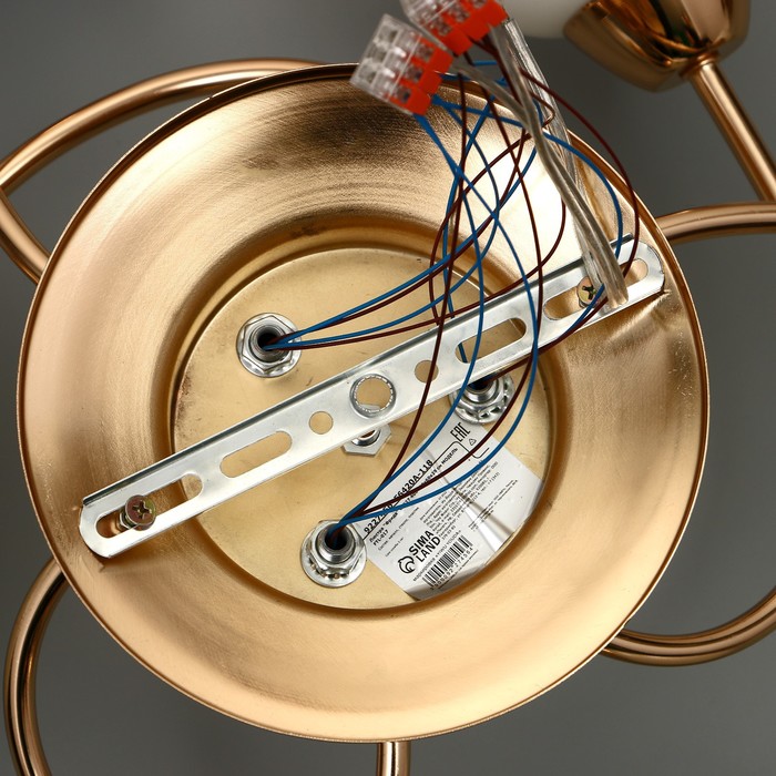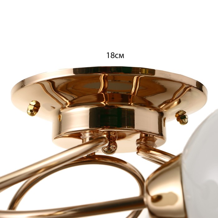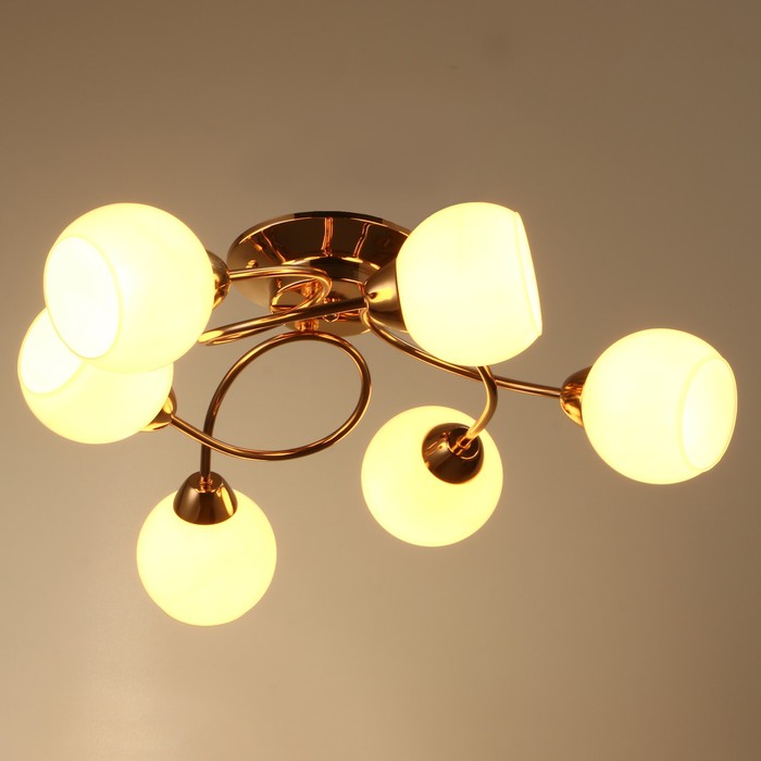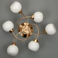 Вид лампы|Накаливания;Количество ламп|6;Стиль|Эконом;Цоколь|E27;Длина, см|60;Ширина, см|60;Высота, см|28;Площадь освещения, м²|12;Минимальная высота от потолка, см|28;Максимальная высота от потолка, см|28;Мощность на цоколь, Вт|40;Степень защиты|IP20;Назначение по помещениям|Гостиная;Назначение по помещениям|Спальня;Назначение по помещениям|Кухня;Материал основания|Металл;Цвет основания|Золотой;Тип рассеивателя|Плафон;Тип подвеса|Без подвеса (потолочный);Оттенок рассеивателя|Светлые тона;Материал рассеивателя|Стекло;Управление светильником|Без пульта;Подходит для натяжных потолков|Да (при использования светодиодных ламп);Плоская|Нет;Тип крепления|На планку;Форма рассеивателя|Полушар;Направление рассеивателя|В стороны;Направление рассеивателя|Вниз;Цвет рассеивателя|Белый;Стиль|Современный;Стиль|Модерн;Тип источника освещения|Лампа не в комплекте;