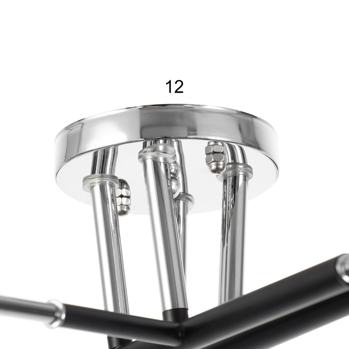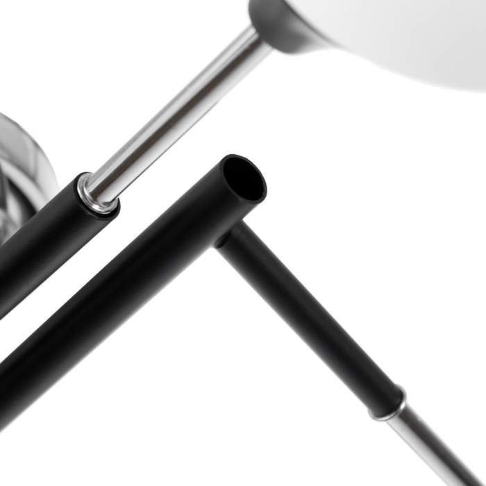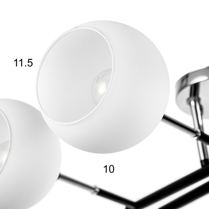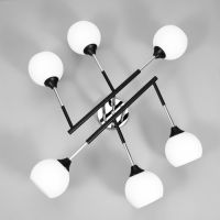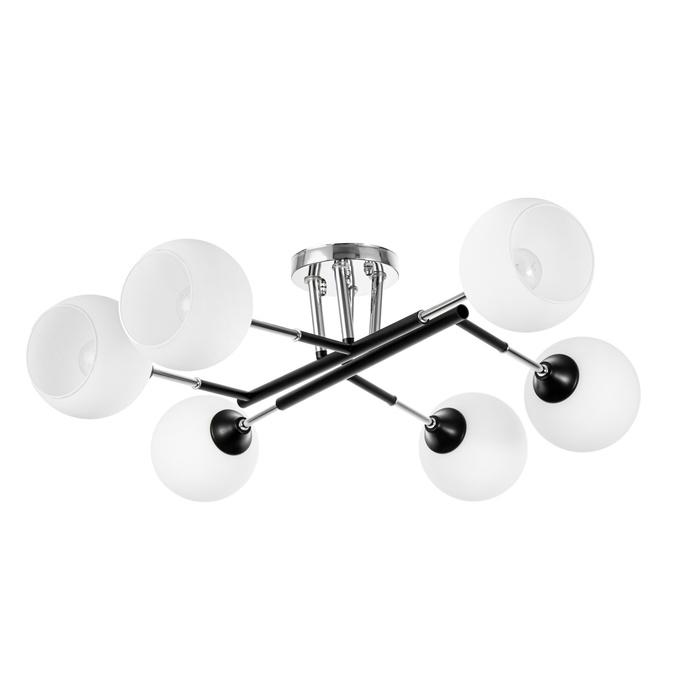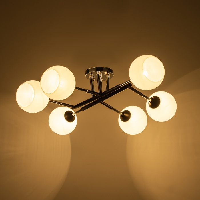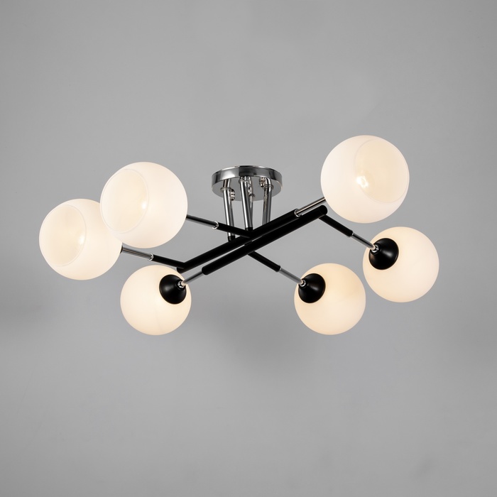 Вид лампы|Накаливания;Количество ламп|6;Стиль|Модерн и хайтек;Цоколь|E27;Длина, см|60;Ширина, см|60;Высота, см|26;Площадь освещения, м²|12;Минимальная высота от потолка, см|26;Максимальная высота от потолка, см|26;Мощность на цоколь, Вт|40;Степень защиты|IP20;Назначение по помещениям|Большой зал;Назначение по помещениям|Гостиная;Материал основания|Металл;Цвет основания|Чёрный;Цвет основания|Хром;Тип рассеивателя|Плафон;Тип подвеса|Штанга;Материал рассеивателя|Стекло;Управление светильником|Без пульта;Подходит для натяжных потолков|Да (при использования светодиодных ламп);Тип крепления|На планку;Форма рассеивателя|Полушар;Цвет рассеивателя|Матовый белый;Стиль|Современный;Тип источника освещения|Лампа не в комплекте;