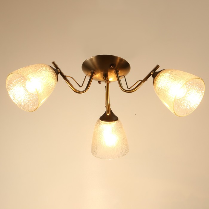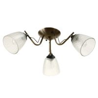 Вид лампы|Накаливания;Количество ламп|3;Стиль|Эконом;Цоколь|E27;Длина, см|47;Ширина, см|47;Высота, см|19;Площадь освещения, м²|6;Минимальная высота от потолка, см|19;Максимальная высота от потолка, см|19;Мощность на цоколь, Вт|40;Степень защиты|IP20;Назначение по помещениям|Гостиная;Назначение по помещениям|Спальня;Назначение по помещениям|Прихожая;Назначение по помещениям|Кухня;Материал основания|Металл;Цвет основания|Бронза;Тип рассеивателя|Плафон;Тип подвеса|Без подвеса (потолочный);Оттенок рассеивателя|Светлые тона;Материал рассеивателя|Стекло;Управление светильником|Без пульта;Подходит для натяжных потолков|Да (при использования светодиодных ламп);Плоская|Нет;Тип крепления|На планку;Форма рассеивателя|Конусный;Направление рассеивателя|Вниз;Цвет рассеивателя|Белый;Стиль|Минимализм;Тип источника освещения|Лампа не в комплекте;