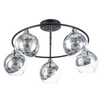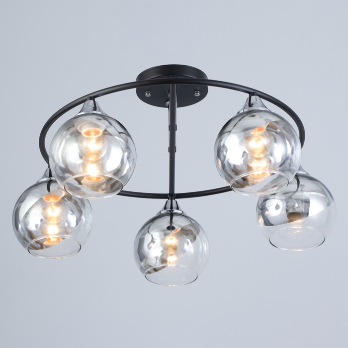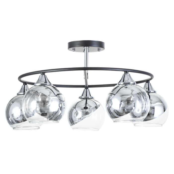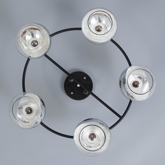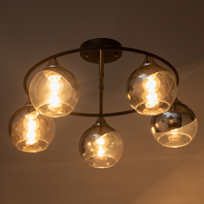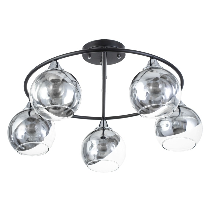 Вид лампы|Накаливания;Количество ламп|5;Стиль|Эконом;Цоколь|E27;Длина, см|55;Ширина, см|55;Высота, см|25.5;Минимальная высота от потолка, см|25.5;Максимальная высота от потолка, см|25.5;Мощность на цоколь, Вт|60;Степень защиты|IP20;Назначение по помещениям|Кухня;Назначение по помещениям|Гостиная;Материал основания|Металл;Цвет основания|Чёрный;Тип рассеивателя|Плафон;Тип подвеса|Без подвеса (потолочный);Оттенок рассеивателя|Светлые тона;Материал рассеивателя|Стекло;Управление светильником|Без выключателя;Подходит для натяжных потолков|Да (при использования светодиодных ламп);Плоская|Нет;Тип крепления|На планку;Форма рассеивателя|Полушар;Направление рассеивателя|Вниз;Цвет рассеивателя|Хром;Цвет рассеивателя|Прозрачный;Стиль|Классика;Тип источника освещения|Лампа не в комплекте;