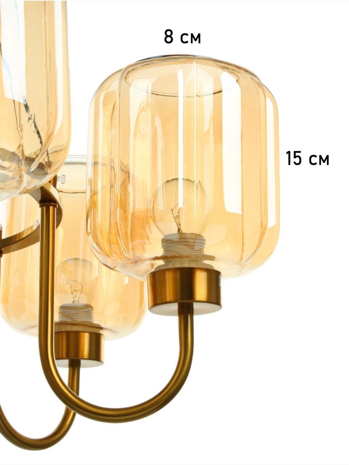 - Тёплый, насыщенный свет: Шесть ламп с цоколем E27 и мощностью до 40 Вт создают световой поток 1260–2800 лм. Прозрачные и янтарные стеклянные плафоны мягко рассеивают свет, наполняя пространство уютным сиянием — особенно эффектно в вечернее время.
