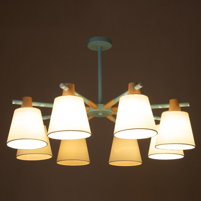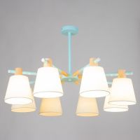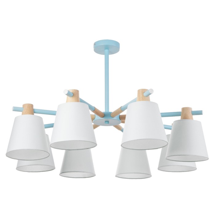 Вид лампы|Накаливания;Количество ламп|8;Стиль|Модерн и хайтек;Цоколь|E27;Длина, см|85;Ширина, см|85;Высота, см|50;Площадь освещения, м²|16;Мощность на цоколь, Вт|40;Минимальная высота от потолка, см|50;Максимальная высота от потолка, см|50;Степень защиты|IP20;Назначение по помещениям|Детская;Назначение по помещениям|Кафе, рестораны;Назначение по помещениям|Гостиная;Назначение по помещениям|Большой зал;Материал основания|Дерево;Материал основания|Металл;Цвет основания|Синий;Цвет основания|Коричневый;Тип рассеивателя|Абажур;Тип подвеса|Штанга;Материал рассеивателя|Текстиль;Материал рассеивателя|Пластик;Материал рассеивателя|Металл;Управление светильником|Без пульта;Подходит для натяжных потолков|Да (при использования светодиодных ламп);Тип крепления|На планку;Форма рассеивателя|Конусный;Цвет рассеивателя|Белый;Стиль|Дизайнерский;Стиль|Детский;Тип источника освещения|Лампа не в комплекте;