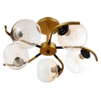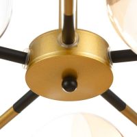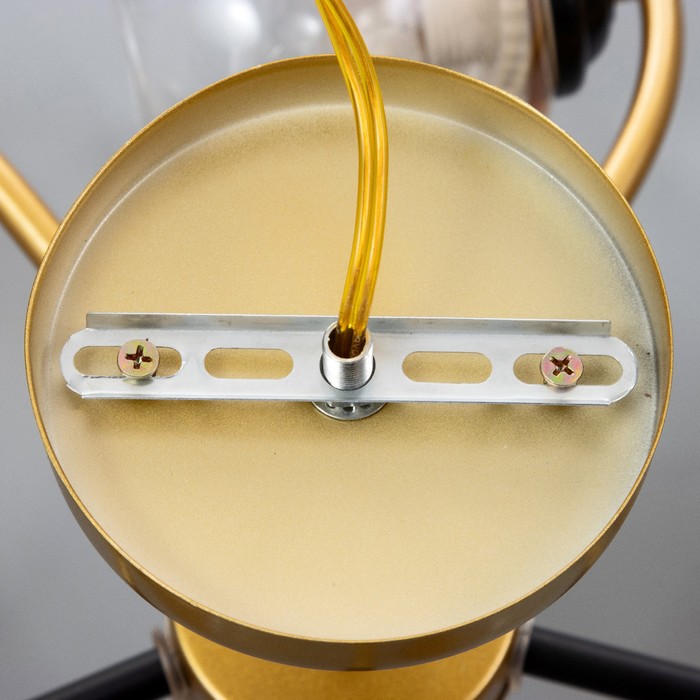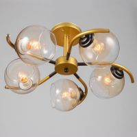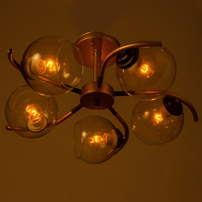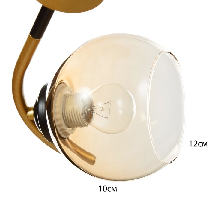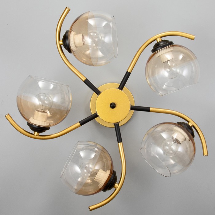 Вид лампы|Накаливания;Количество ламп|5;Стиль|Модерн и хайтек;Цоколь|E27;Длина, см|60;Ширина, см|30;Высота, см|27;Площадь освещения, м²|10;Мощность на цоколь, Вт|40;Степень защиты|IP20;Назначение по помещениям|Спальня;Назначение по помещениям|Гостиная;Назначение по помещениям|Кухня;Назначение по помещениям|Кафе, рестораны;Материал основания|Металл;Цвет основания|Золотой;Цвет основания|Чёрный;Тип рассеивателя|Плафон;Тип подвеса|Штанга;Материал рассеивателя|Стекло;Управление светильником|Без пульта;Подходит для натяжных потолков|Да (при использования светодиодных ламп);Тип крепления|На планку;Форма рассеивателя|Полушар;Цвет рассеивателя|Медовый;Стиль|Современный;Стиль|Модерн;Тип источника освещения|Лампа не в комплекте;