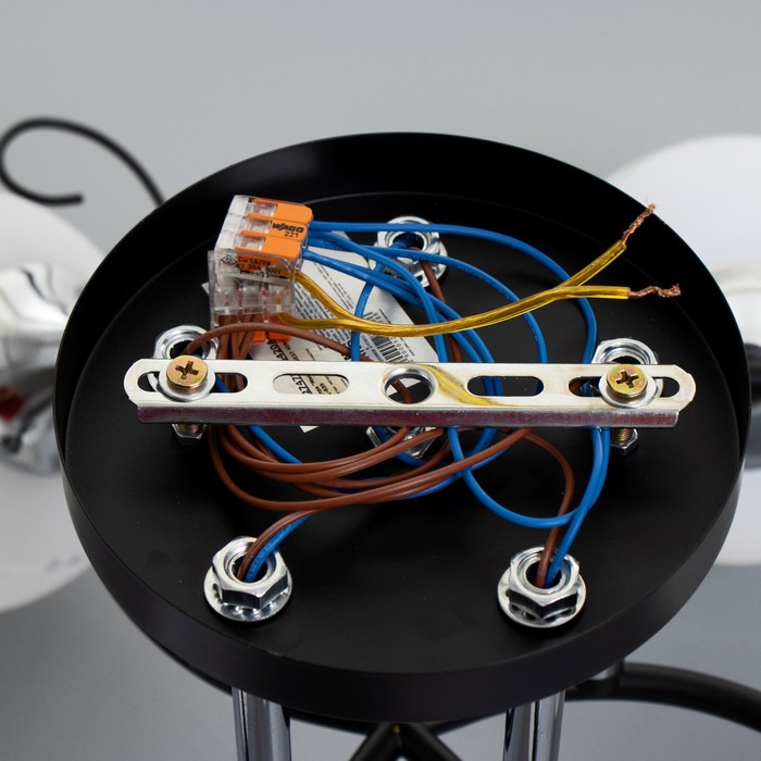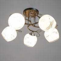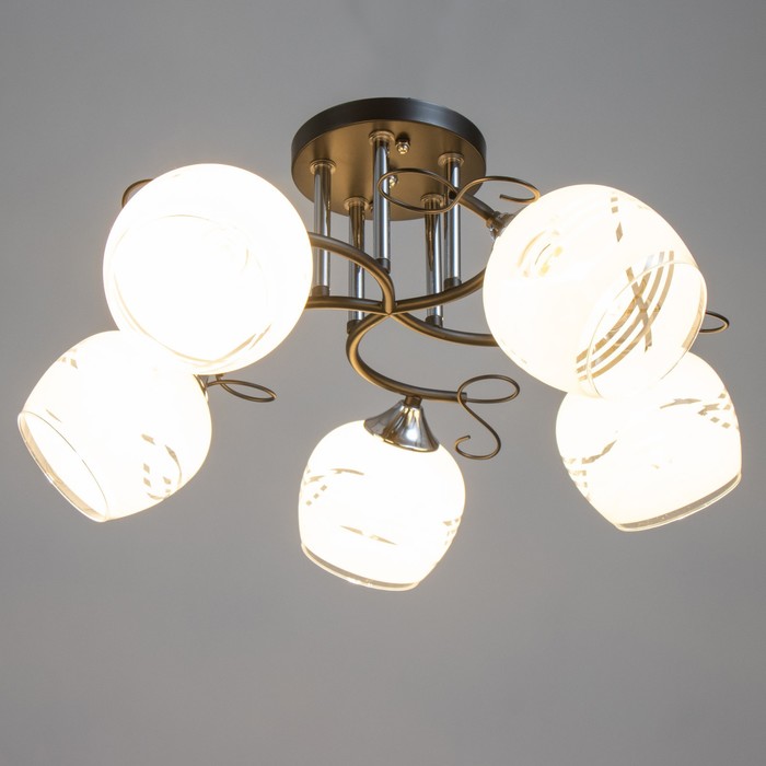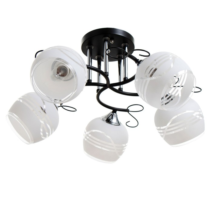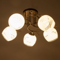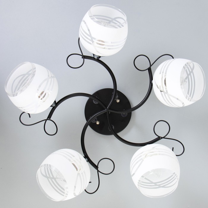 • Пять стеклянных плафонов: Полусферические рассеиватели из белого стекла создают мягкое равномерное освещение. Цоколи E27 поддерживают лампы накаливания или светодиодные источники мощностью до 40 Вт.