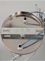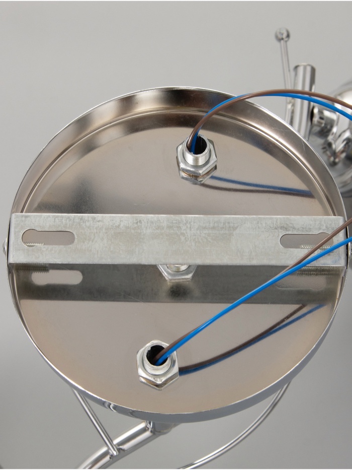 - Металлическое основание в цвете хром: Устойчивый корпус из металла с глянцевым покрытием выдерживает нагрузку и визуально «парит» под потолком. Хром сочетается с белым, серым, чёрным и деревянными поверхностями.
