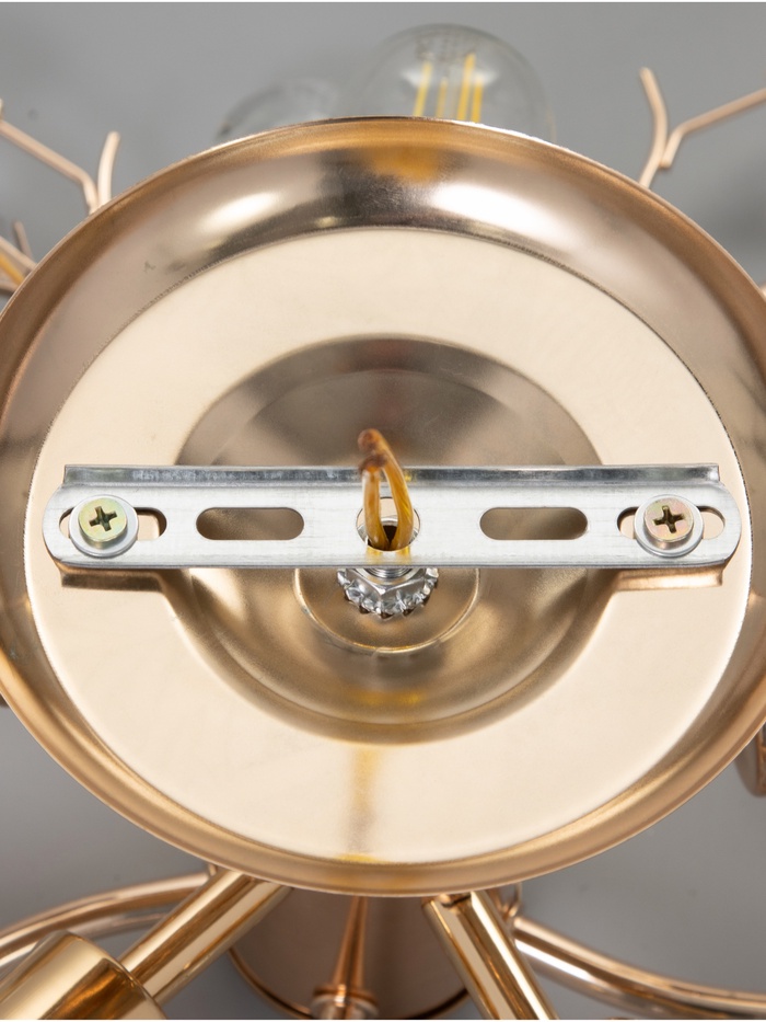 - Золотой металлический каркас: Основание из металла с золотым покрытием сочетает прочность и декоративность. Цвет добавляет интерьеру благородства, не перегружая его. Открытые лампы становятся частью дизайна, особенно винтажные или с декоративной нитью.
