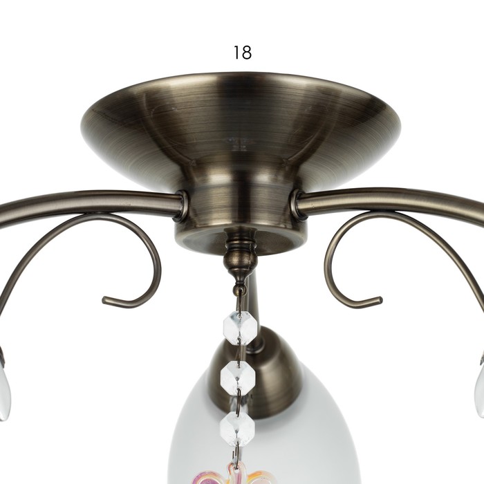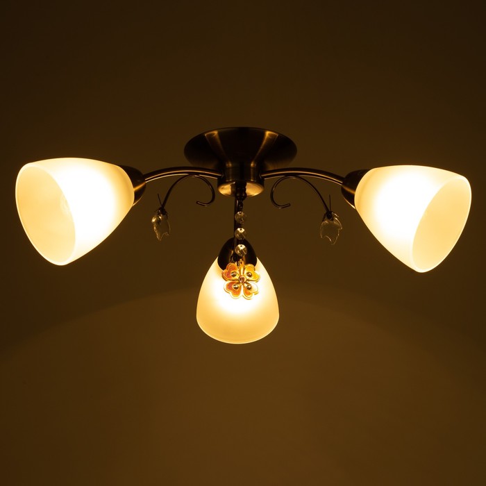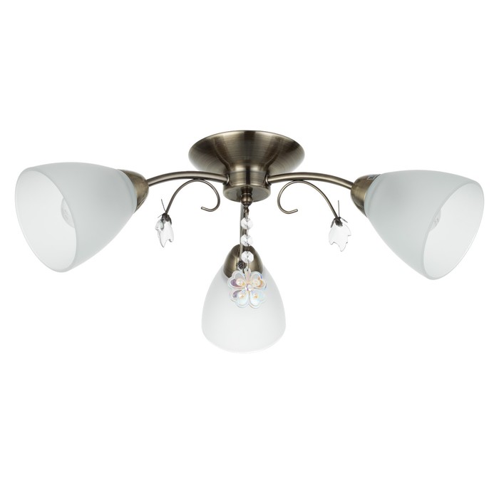 Вид лампы|Накаливания;Количество ламп|3;Стиль|Эконом;Цоколь|E27;Длина, см|45;Ширина, см|43;Высота, см|20;Площадь освещения, м²|6;Минимальная высота от потолка, см|20;Максимальная высота от потолка, см|20;Мощность на цоколь, Вт|40;Степень защиты|IP20;Назначение по помещениям|Гостиная;Назначение по помещениям|Кафе, рестораны;Назначение по помещениям|Кухня;Назначение по помещениям|Спальня;Назначение по помещениям|Прихожая;Материал основания|Металл;Цвет основания|Бронза;Тип рассеивателя|Плафон;Тип подвеса|Без подвеса (потолочный);Оттенок рассеивателя|Светлые тона;Материал рассеивателя|Стекло;Управление светильником|Без пульта;Подходит для натяжных потолков|Да (при использования светодиодных ламп);Плоская|Нет;Тип крепления|На планку;Форма рассеивателя|Конусный;Направление рассеивателя|Вниз;Цвет рассеивателя|Белый;Стиль|Минимализм;Тип источника освещения|Лампа не в комплекте;