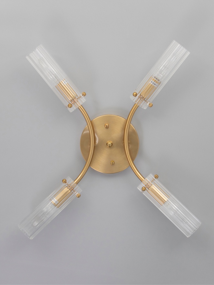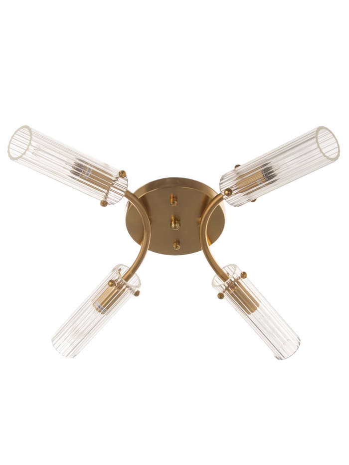 Чёткая симметрия, прозрачность, благородство: Четыре цилиндрических плафона расположены сбалансированно, создавая ощущение порядка и стабильности. Бронзовый каркас и прозрачное стекло работают в паре: металл добавляет веса, а стекло – лёгкости. Это не просто источник света – это архитектурный элемент, который организует пространство. Подходит для современных и лофтовых интерьеров, где важны чистые линии, свет и сдержанная выразительность.