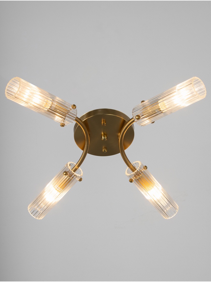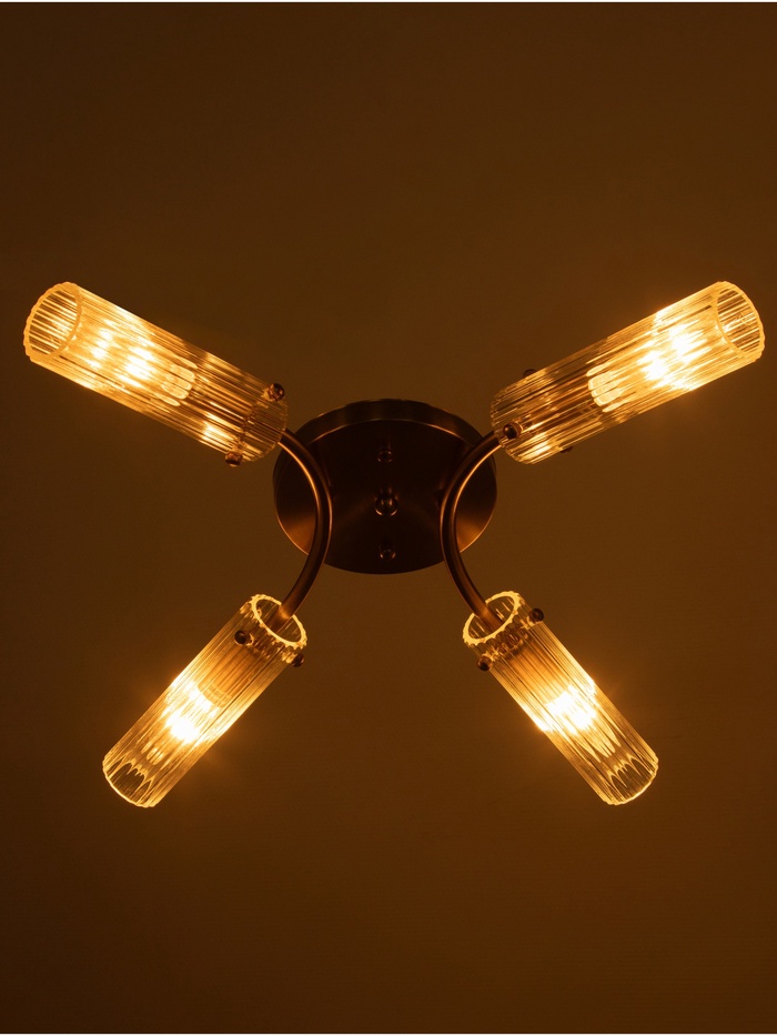 - Сильный световой поток: Четыре лампы формата E27 (до 40 Вт каждая) обеспечивают яркое, равномерное освещение с общим световым потоком 1260–2800 лм, достаточное для помещений площадью до 8 м?. Прозрачные стеклянные цилиндры не рассеивают, а усиливают свет, подчёркивая объём пространства.