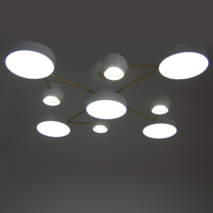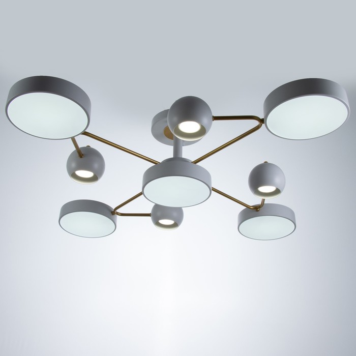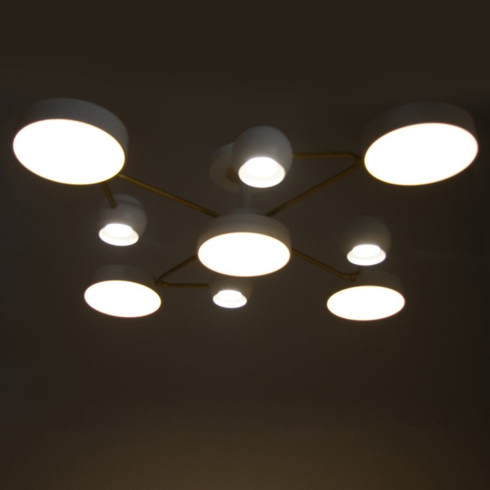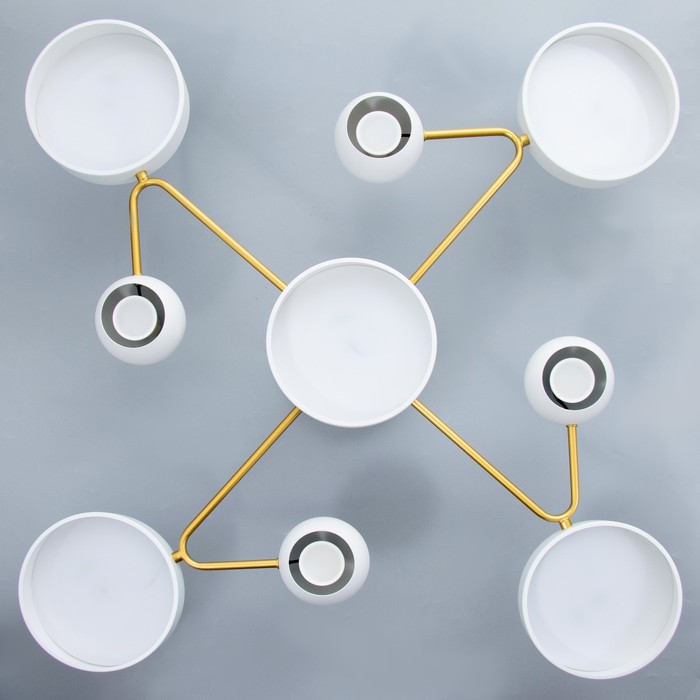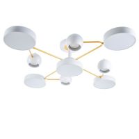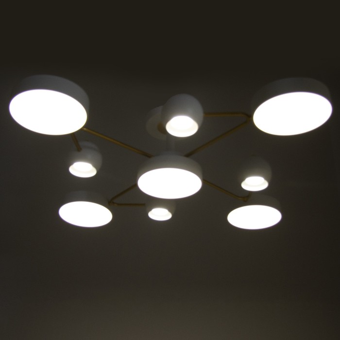 Свет, который охватывает пространство с лёгкостью. Пятирожковая потолочная LED-люстра с бело-золотым металлическим основанием и круглыми рассеивателями – это мощное, но воздушное решение для гостиной, кухни или спальни, где важны интенсивность света, равномерное покрытие и современный облик.