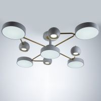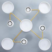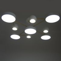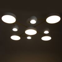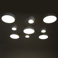 Ширина, свет и баланс: Пять круглых рассеивателей из пластика и металла расположены симметрично, создавая ощущение порядка и стабильности. Направленный вниз свет равномерно охватывает пространство, не создавая тёмных зон. Это не просто источник света – это центр освещения, который работает на комфорт и порядок. Подходит для тех, кто ценит скандинавский стиль, чистоту линий и свет, который охватывает всё, не перегружая визуально.
